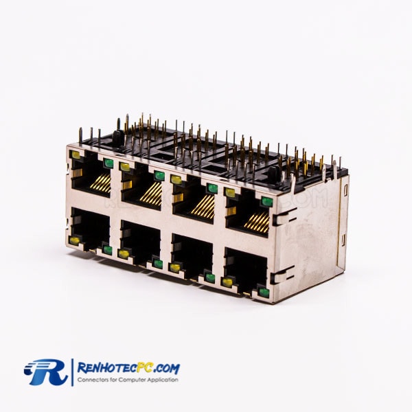 Tags: RJ45,Female,PCB Mount,2*4,Double Row,8 Port,Right Angle/90°,With Shield,With LED